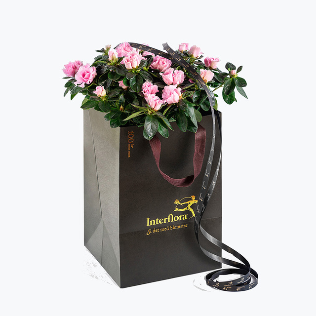 En gavepose fylt med årstidens populære Azalea som er allergivennlig. Et godt valg til både ung og gammel! En blomstrende tradisjonell hilsen som vil glede den heldige mottakeren.